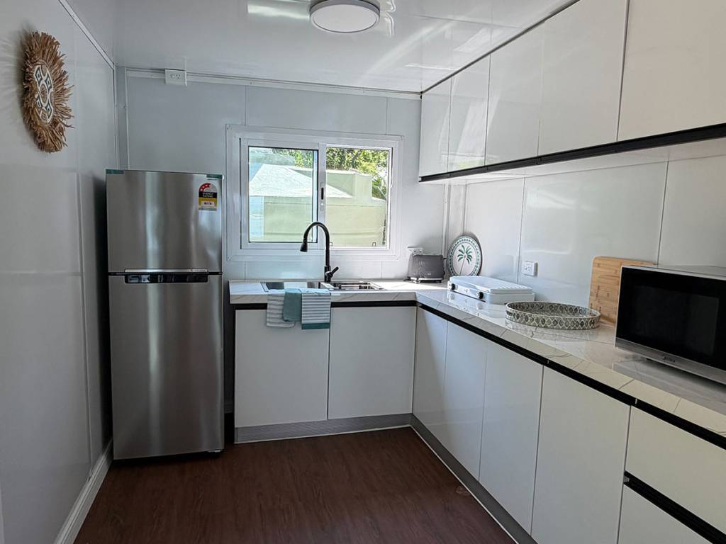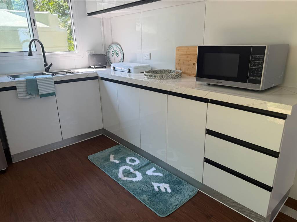 Inside, you’ll find an open-plan kitchen and living area designed for relaxed, easy living. The kitchen is fully equipped with an oven, stovetop, microwave, cooking pots, pans, utensils, and everything you need to prepare your own meals using fresh island produce. Whether you're cooking breakfast or enjoying sunset drinks, you'll have all the comforts of home right at your fingertips.
